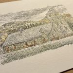 This is a stippled pen and ink with some color wash. 5×7 on 9×12 artboard.