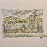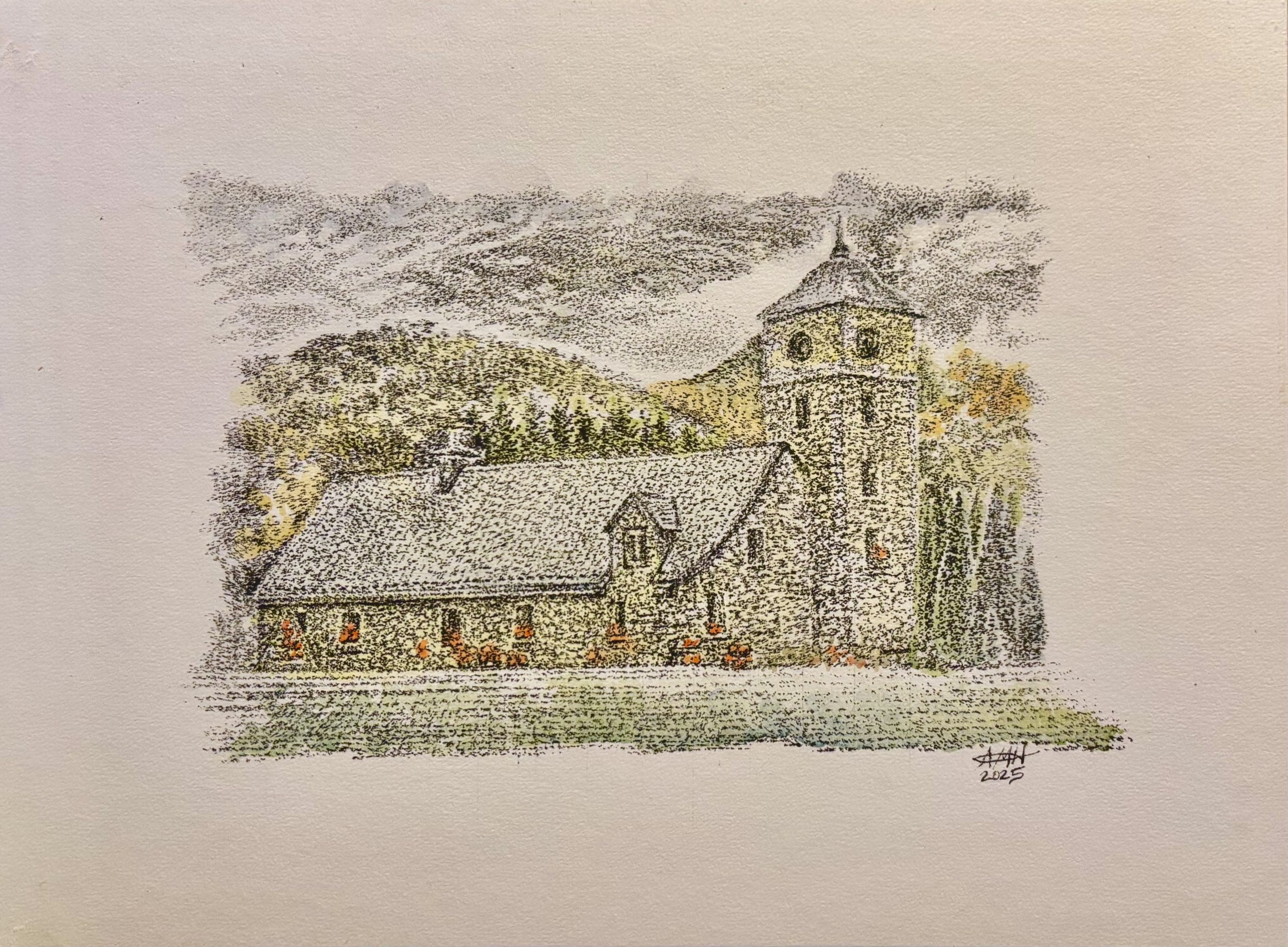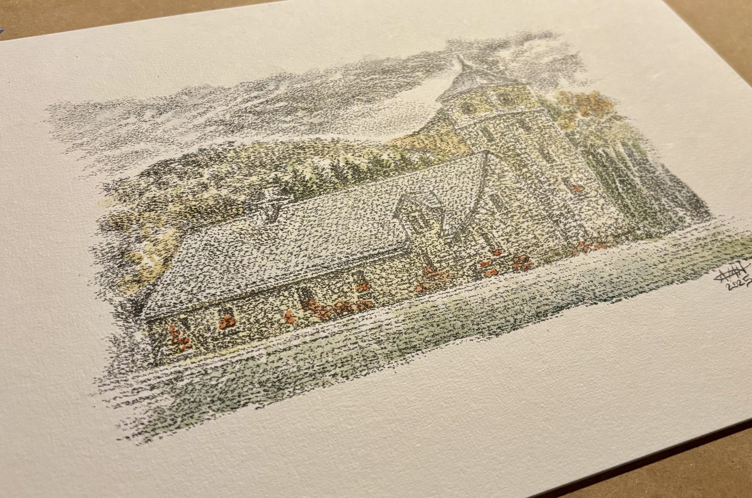 ­This is a stippled pen and ink with some color wash. 5×7 on 9×12 artboard.